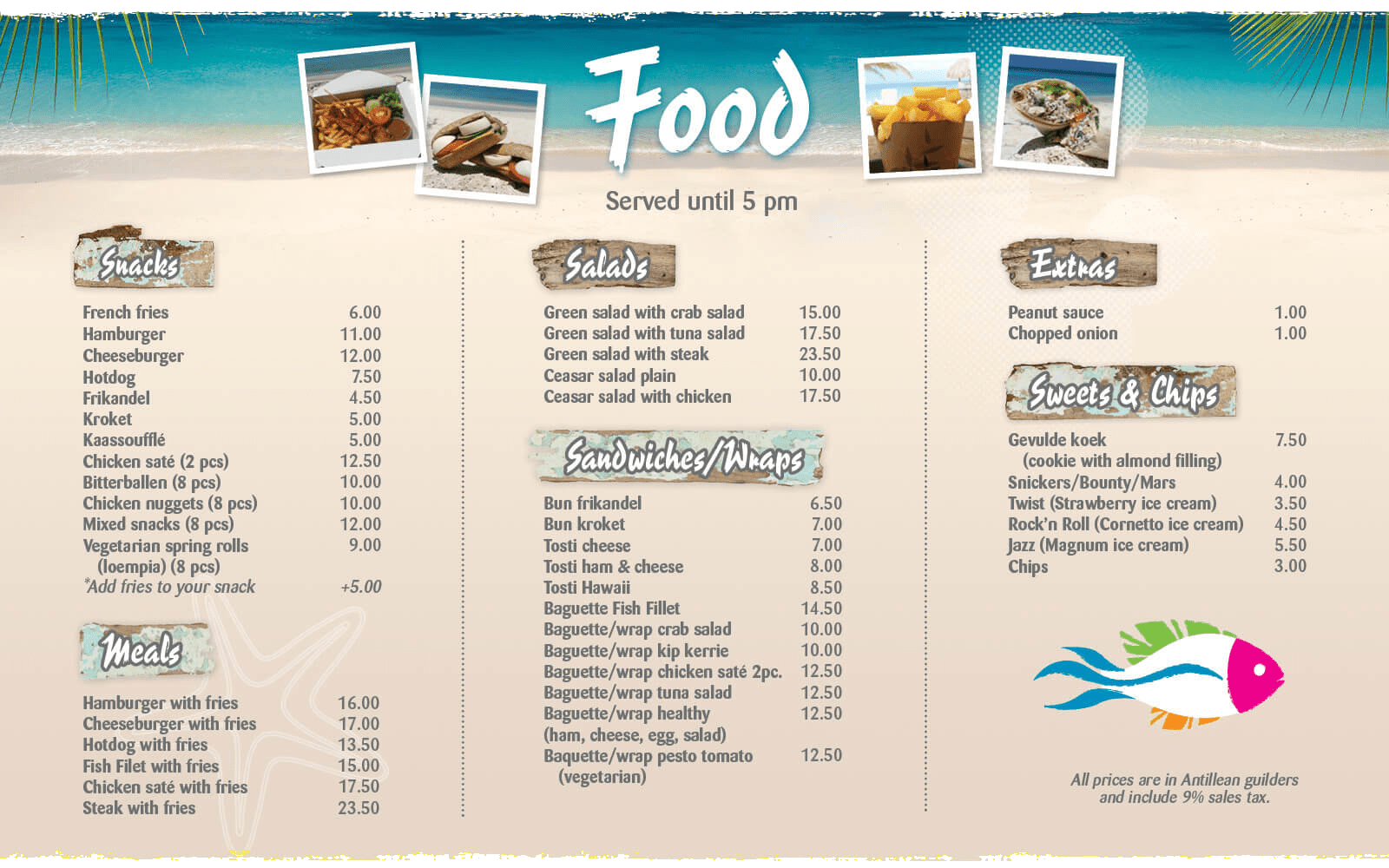 You can also get some nice frozen cocktails or an ice cold beer or soda. Take a seat at one of the tables around the bar of take your food en drinks up to the beach. We only serve paper disposals so this will not hurt nature!